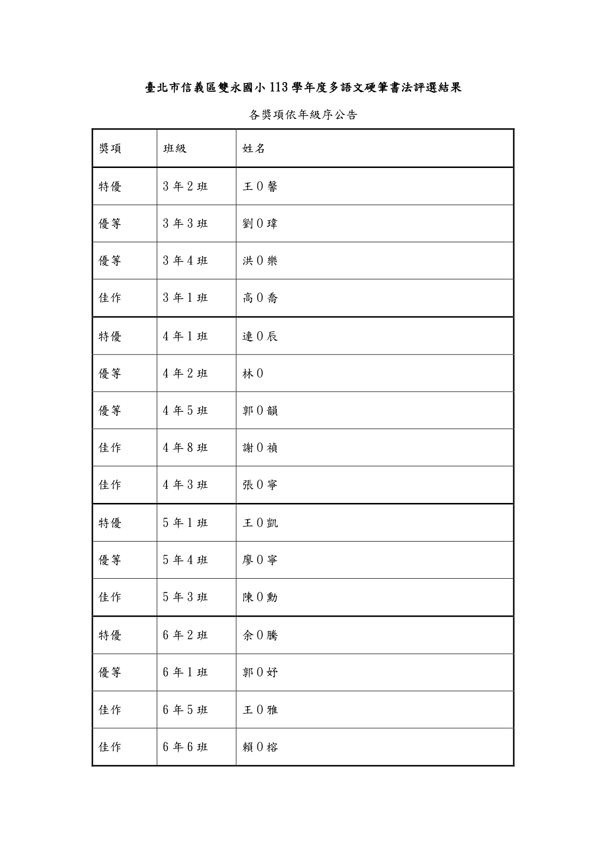 臺北市信義區雙永國小 113 學年度多語文硬筆書法評選結果