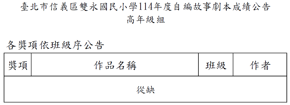 並由得獎之作品,代表學校參加114學年度臺北市自編故事劇本評選。